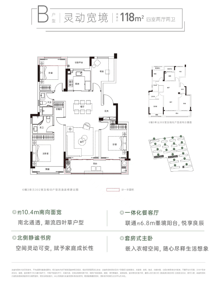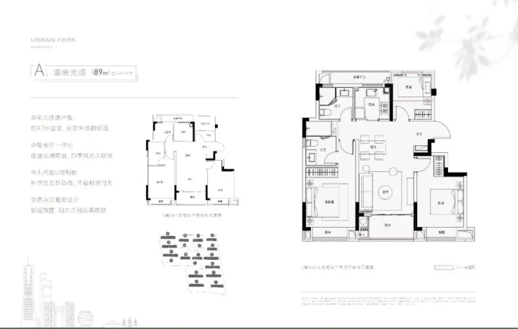 在售户型:主力户型为建面约89㎡的三房两厅两卫和约117㎡的四房两厅两卫。所有户型均为一梯两户、南北通透的设计。