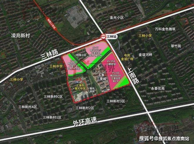 该地块为三林镇金光村“城中村”改造的重点项目,紧邻地铁11号线三林站,规划一条12米宽公共步行通道,连接社区与地铁站;同时周边有中房金谊广场、三林中学、东方医院等生活配套。