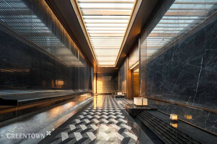主入口知·云栖,取意西湖十景以"洄游"为理念,超52米跨度的回字形布局,重构传统"四水归堂"空间序列,约2.4米“流光礼宾”塔冠,如悬浮的美学灯塔,与金色挑檐相映成辉,全封闭式阳台勾勒建筑轮廓,让立面如镜幕般收纳约30公里江岸鎏光!
