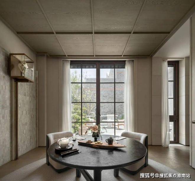 茶室是庭院空间在东方记忆中的过渡景观。青砖与多种材质的结合,内部以米色纹理涂料和木纹为主色调,打造出宁静优雅的氛围。