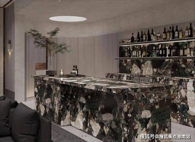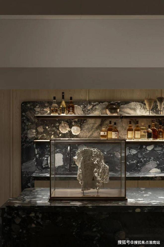 主要空间为沙龙和酒吧。在开放式的吧台上,表面灰色大理石,结合温暖的光线给人一种恰到好处的舒适感。