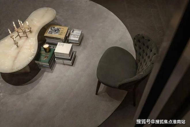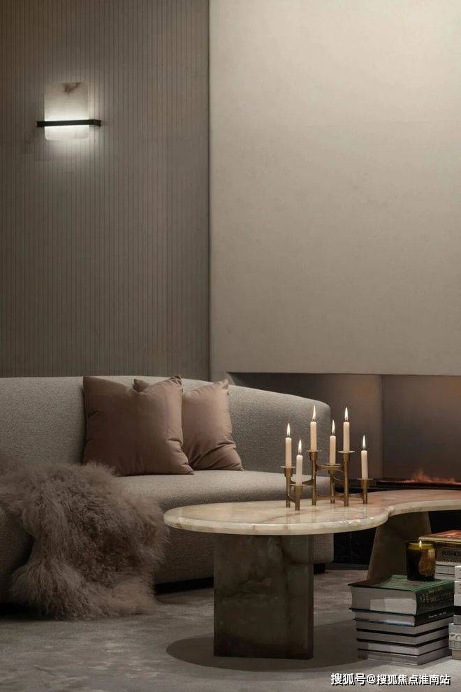 麂色沙发后是一个部分开放的展览空间,浅色的布艺沙发、温暖的炉火、搭配复古风格的玉色茶几和金属烛台,打造出一个宁静的阅读空间。