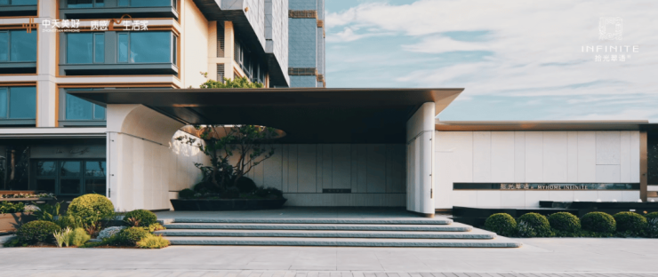 金色飘檐擦亮辨识度,南立面以大面玻璃主打,白、金、蓝灰为主调,配合部分涂料;基部用上了贝金米黄大理石,温润如月光。