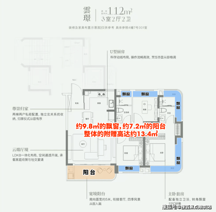 这个户型有约9.8㎡的飘窗,约7.2㎡的阳台,整体的附赠高达约13.4㎡。这是目前上海外环沿线,是附赠率最高的一个小高层产品。