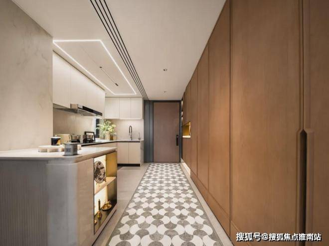 玄关位置地面采用石材,个性化的logo拼花,尊崇感十足,配合定制玄关柜,柜内交付有除臭精灵,功能性与颜值,双双拉满。