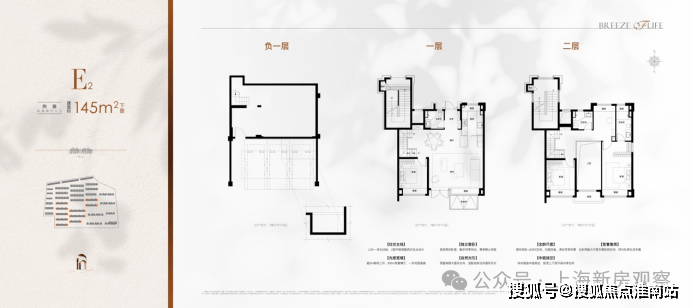 195㎡滨水联排:地上三层 + 地下两层,6米挑高餐客厅 + 双套房设计,前庭后院环绕,地下室可改造为影音厅、藏品室等,总价区间1367–1582万元