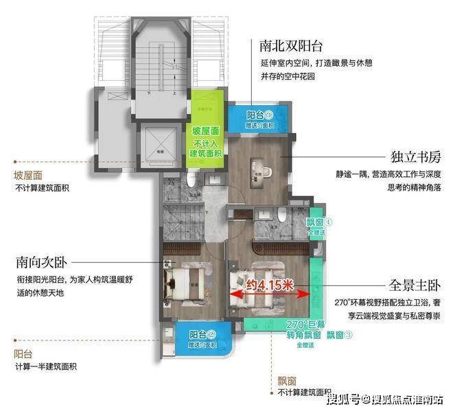 该户型附赠4个飘窗+3露台+1阳合½+挑空+闷顶等,实得率约135%!