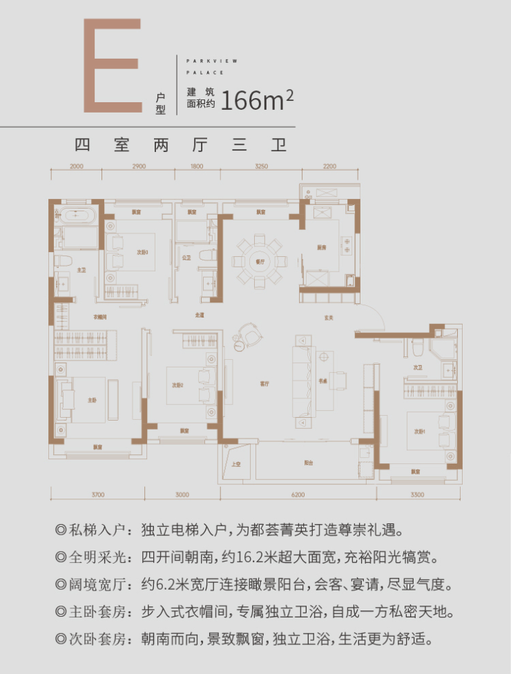 全板式户型设计,南北通透,3.1米层高,166㎡户型享6.2米宽厅+独立电梯入户