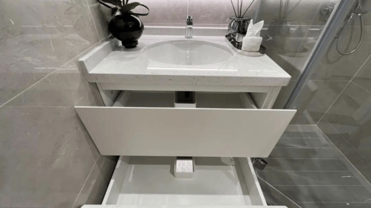 卫生间洗手池下的空间向来是卫生死角,还有弯曲的水管绕来绕去。项目却别出心裁地将这个死角做成了储物柜,充分利用空间。