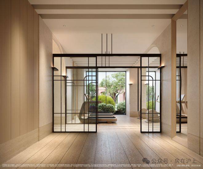 全系风雨连廊。项目打造了上海市场罕见的“流线全覆盖”连廊系统。这条连廊不仅是遮风避雨的通道,其下方空间更被打造为一座与花园景观交融的“线性美术馆”。让业主归家成为穿梭时空的艺术之旅。