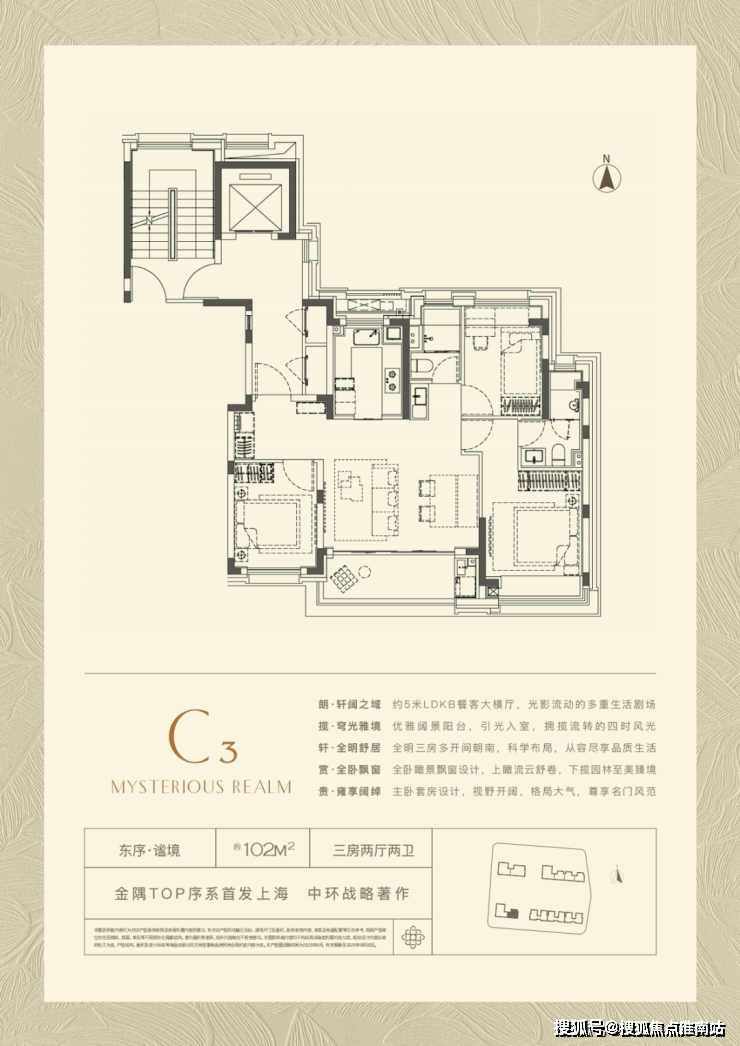 同样的设计巧思应用于约102㎡样板间(三房两厅两卫),打造出近乎双套房的生活体验。5米面宽横厅设计,营造极致通透感,臻选奢石融入空间,优雅时尚。厨房科学动线设计,搭配国际品牌五金和厨电,悦享精致烹饪时刻。主室内皆引入国际一线精装品牌(嘉格纳、博世、弗兰卡、骊住,杜拉维特、汉斯格雅),重构人居品质价值维度。
