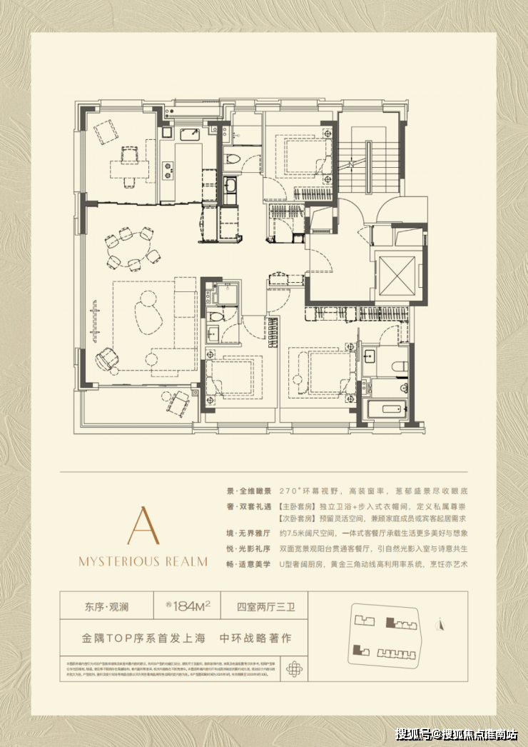 约184㎡样板间,四房两厅三卫格局,LDKB一体化设计,客餐尺度达7.5米面宽,270°极致环幕窗景,最大化引景入室,百万方森态谧境成为私享级流动窗景。行政级主卧套房,打造步入式衣帽间、私享卫浴及南向超阔飘窗。在双套房的设计之上,公卫与北向次卧在空间布局上融入巧思,打造出了多一套间的生活体验。
