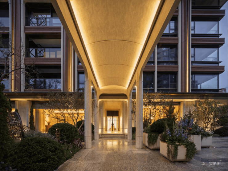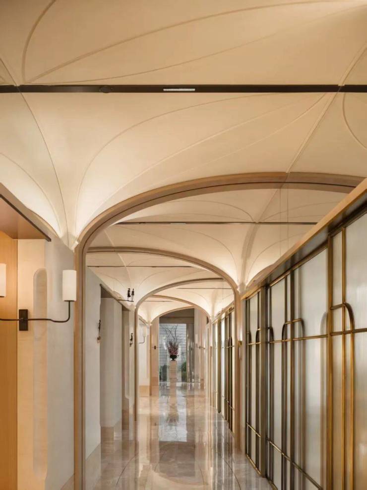 设计团队把连廊下方的空间和花园景观揉在一起,做成了一条“线性美术馆”——拱形的吊顶,考究的廊柱,让归家成为一场艺术。