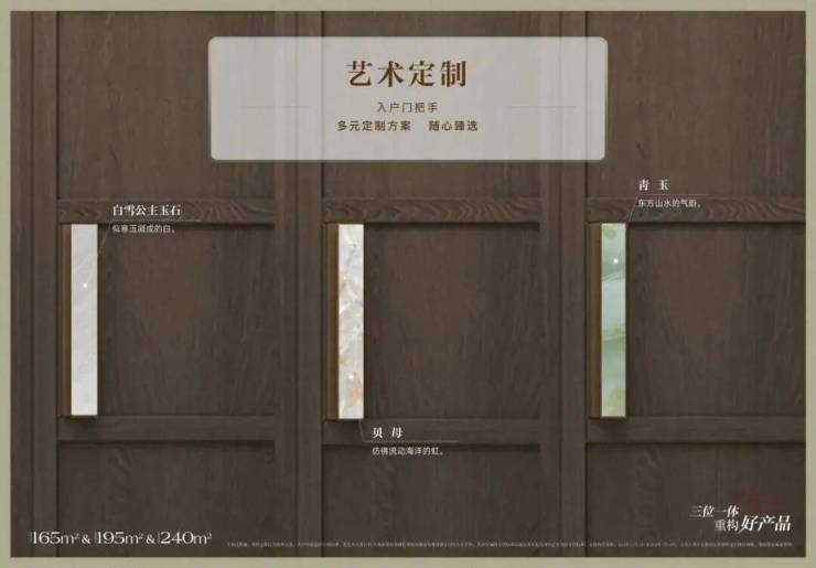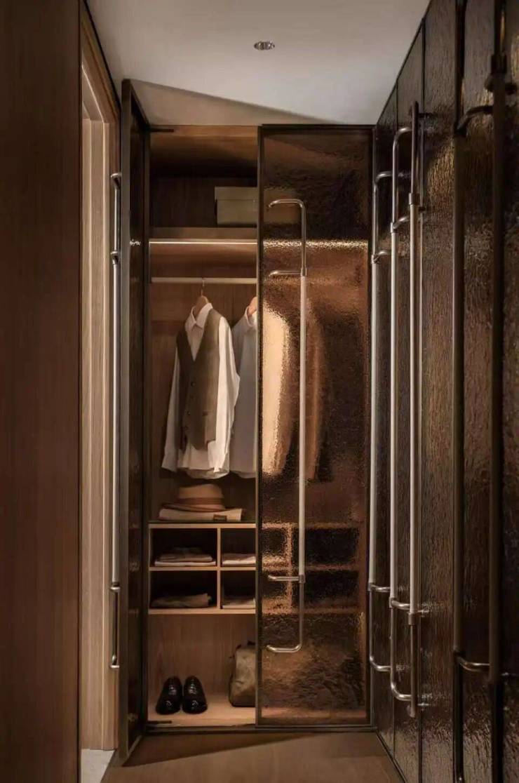 全屋衣柜的柜门可根据业主偏好,选择选木质门或玻璃门两种;门把手的材质也提供了白雪公主、贝母、青玉三种材质的选择。