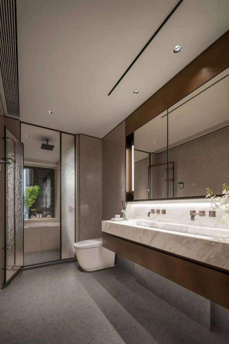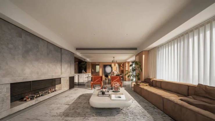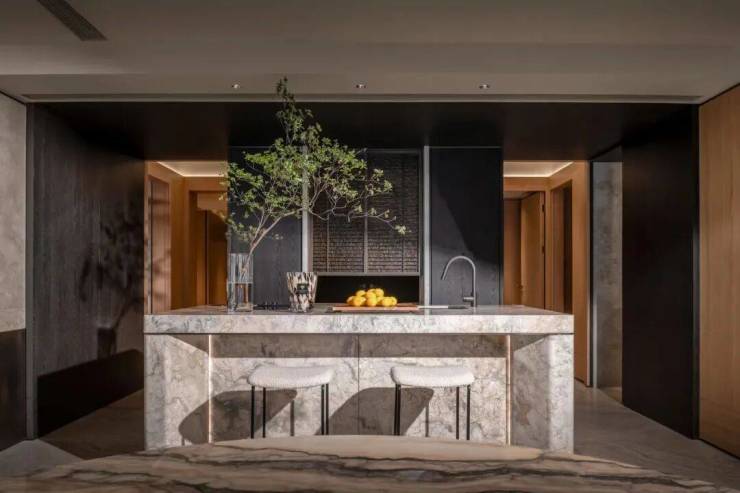 比如全屋仅石材就采用了8种石材及配色,包括祥云灰、卡迪灰等等,并在室内多处空间采用通铺手法,使得空间上下更有机统一。