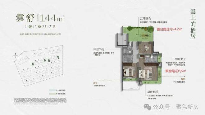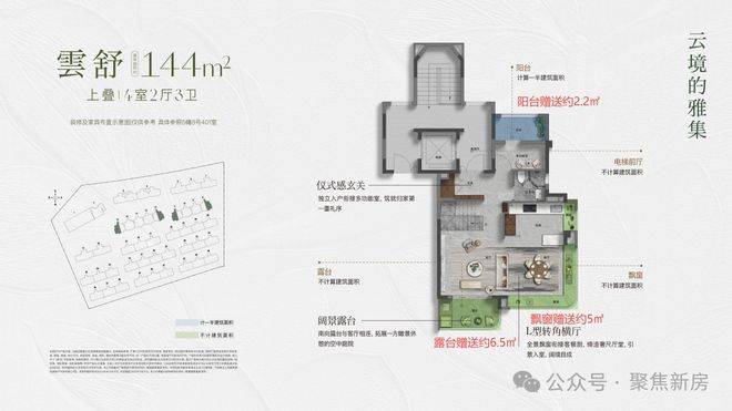 约144㎡上叠,入户独立梯厅,带来更好的功能利用和私密性。