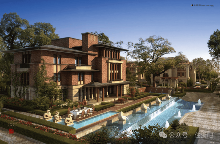 将19世纪末20世纪初美国现代主义设计大师赖特的建筑精髓引入设计中,既有美国西部草原洒脱奔放的气质,兼具欧洲古典建筑的细腻与典雅,和流水别墅同宗。注重与环境的融合,大量平直的线条营造大气,粗狂的气度。