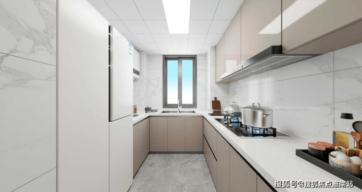 厨房为U型布局,配置定制橱柜、老板烟灶、林内热水器,台面为人造石,水槽为邦克台下盆,细节处体现人性化考量。