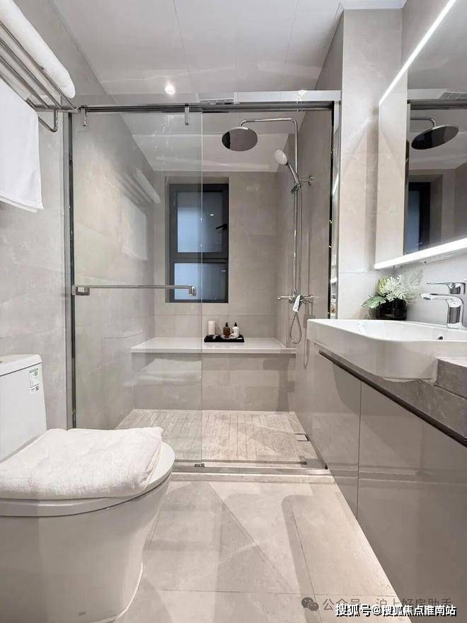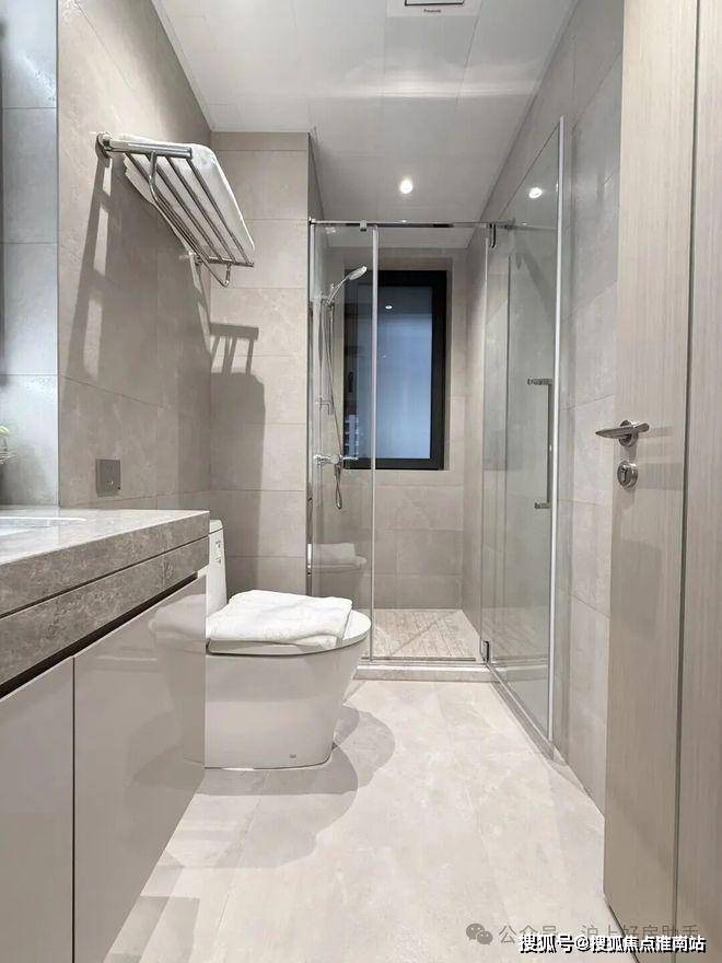 另外,一般百平米主卫淋浴房都是钻石型的,但项目是“一字型”的。“一字型”相比“钻石型”,洗澡空间更大,哪怕带着小朋友也不用挤得“转圈圈”,舒适度提高了不止一点点。