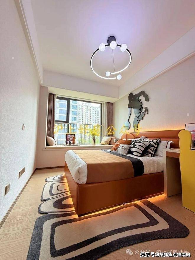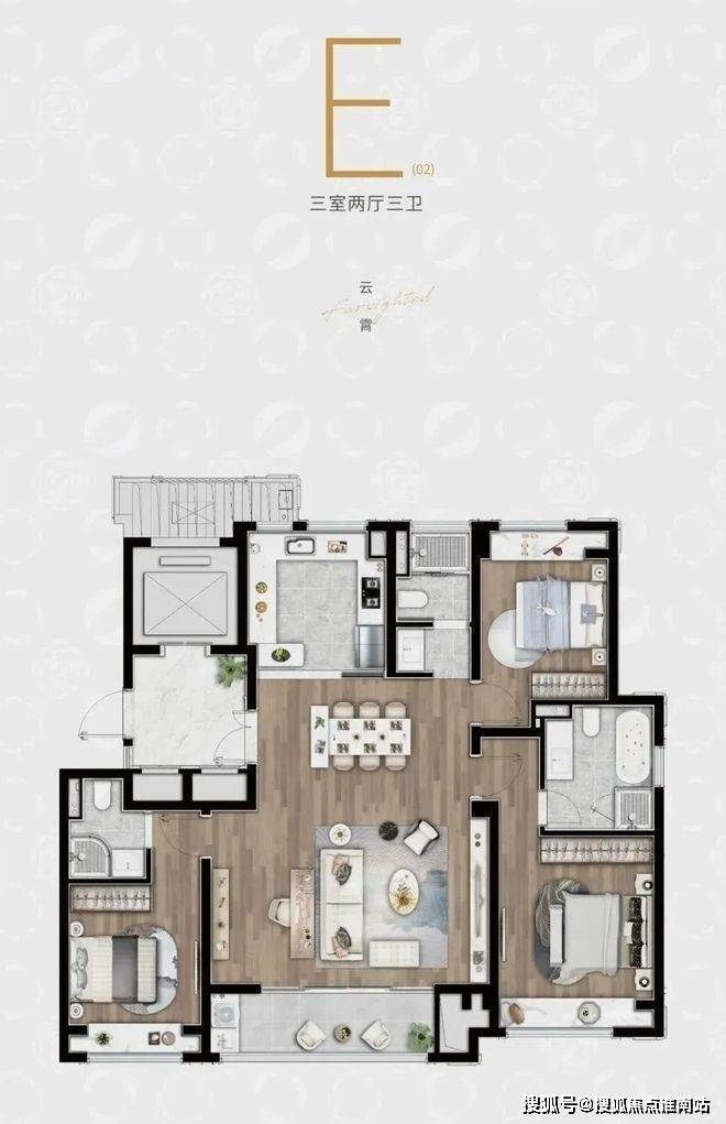 约98㎡3房2卫户型,三开间朝南,并且这贯穿客厅+次卧的超大阳台实在是惹眼,这个南向的视野延展度以及采光度相比同级别的户型来说,要更加出色。