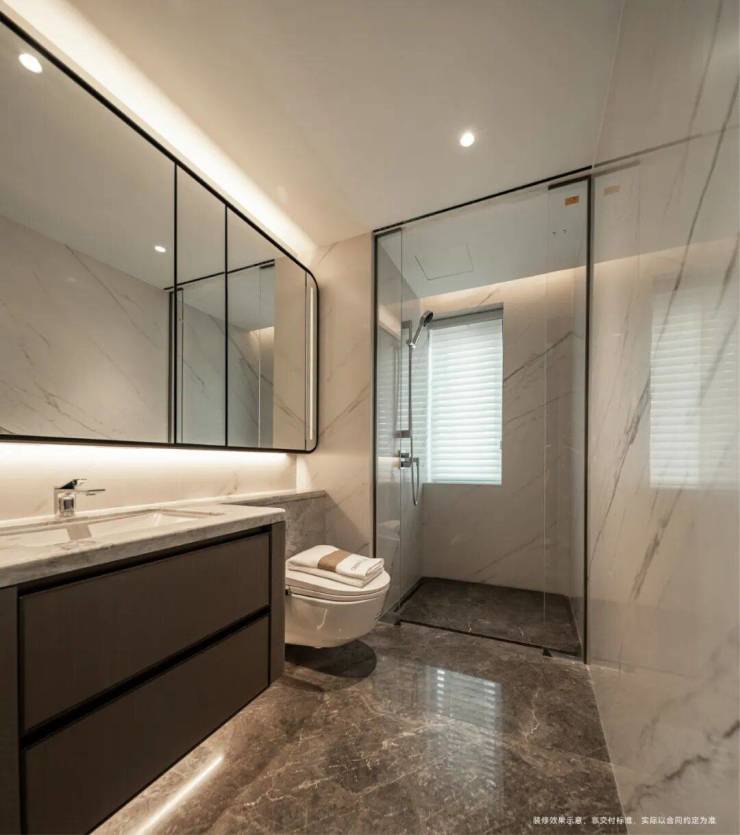 卫浴空间同样是“国际大牌集合地”:德国劳芬智能马桶、法国当代龙头花洒,主卫更是配备双台盆+独立浴缸+淋浴区,满足高端居住的舒适需求。