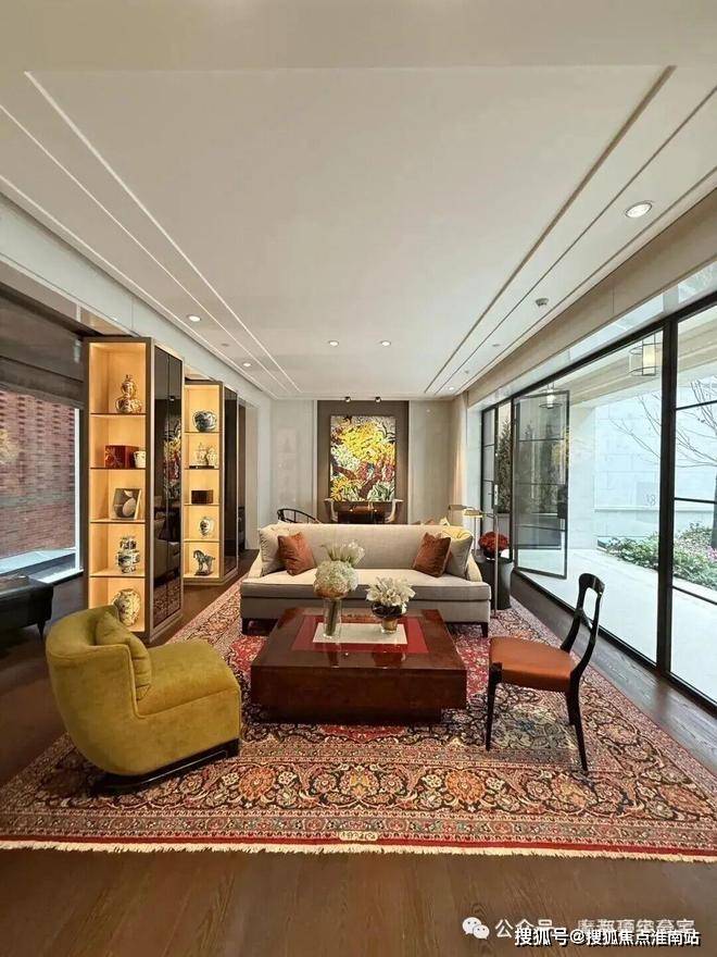 正式的大沙发区域,灵活散座区域,家具注重收藏种类多样性,中式圈椅,西式小沙发,灵活移动,根据需求可聚可散。手工编织的复古羊毛波斯地毯,用植物和矿物天然染料来进行染色,拥有了抗衡时间侵蚀的美,更增加了收藏的丰富性,是高品味的体现。