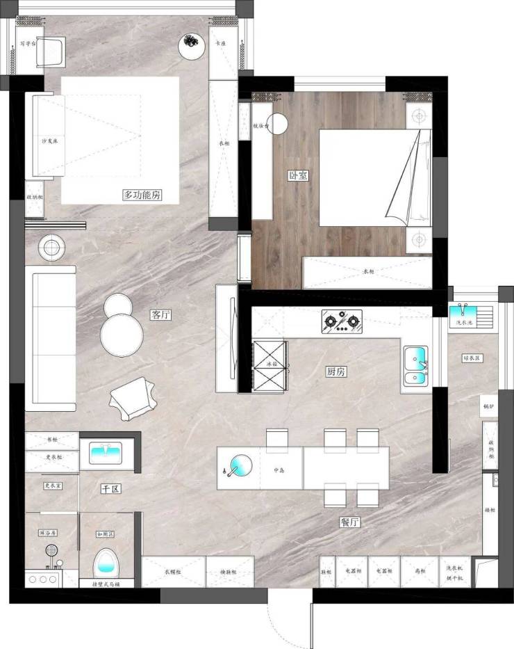 ❀2. 因业主一个人居住,父母偶尔过来小住几天,故取消了固定次卧功能,改为多功能房;父母过来当客房,父母没过来的时候多功能室即可作为书房,休闲室,活动室。增加了功能性的同时空间也得到了释放,一改之前的拥挤局促感。
