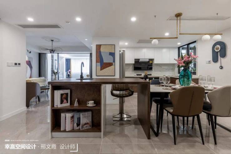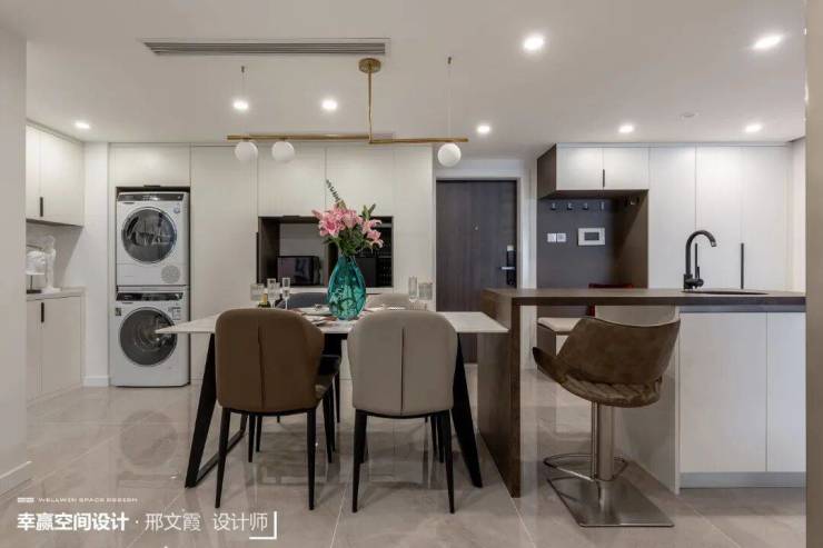 ❀1. 设计师将厨房移到原次卧的位置,开放式厨房结合餐厅一起设计后整体视觉感变大,将岛台中置,面向餐桌,让西厨和餐厅的连贯性更强。