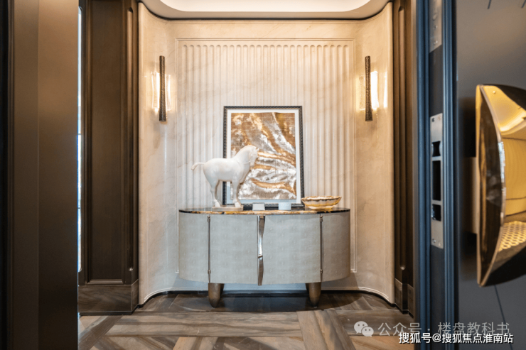 电梯厅的宠物识别按钮是艺术家定制款;入户门把手出自艺术家刘建华之手,用整块实心铜锭经锻造、打磨、电镀等多道精密工艺制成,握住的瞬间就是与艺术的触碰