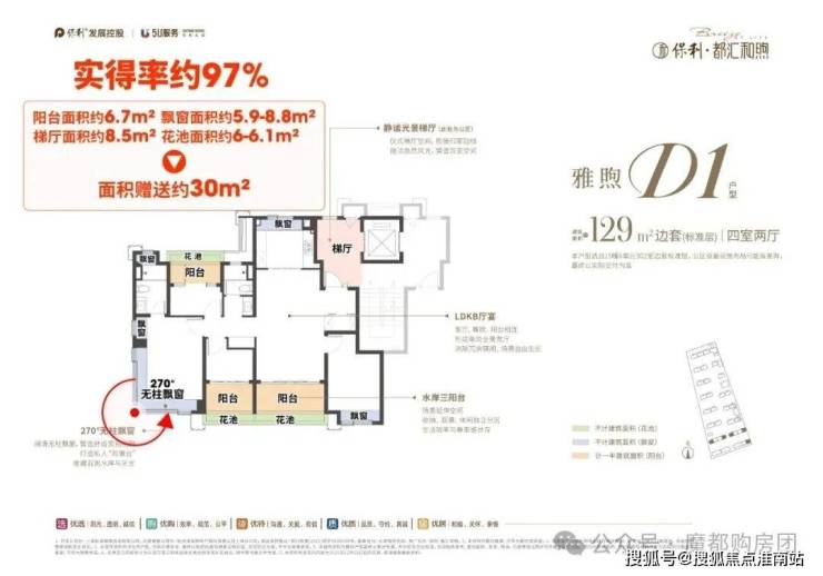 洋房标准层边套赠送面积约30㎡,实得率高达97%,相当于直接赠送约200多万价值,常规项目80%的实得率与之相比差距明显,该户型实际可享受常规155-160㎡的空间尺度。