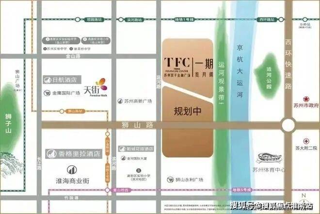 本项目在狮山桥下,京杭大运河旁,占据了新区狮山板块的核心地段,坐享新区繁华商圈,紧邻姑苏古城风韵,集人文精神和高品质生活为一体,将打造为狮山板块乃至苏州市具有代表性的地标建筑.