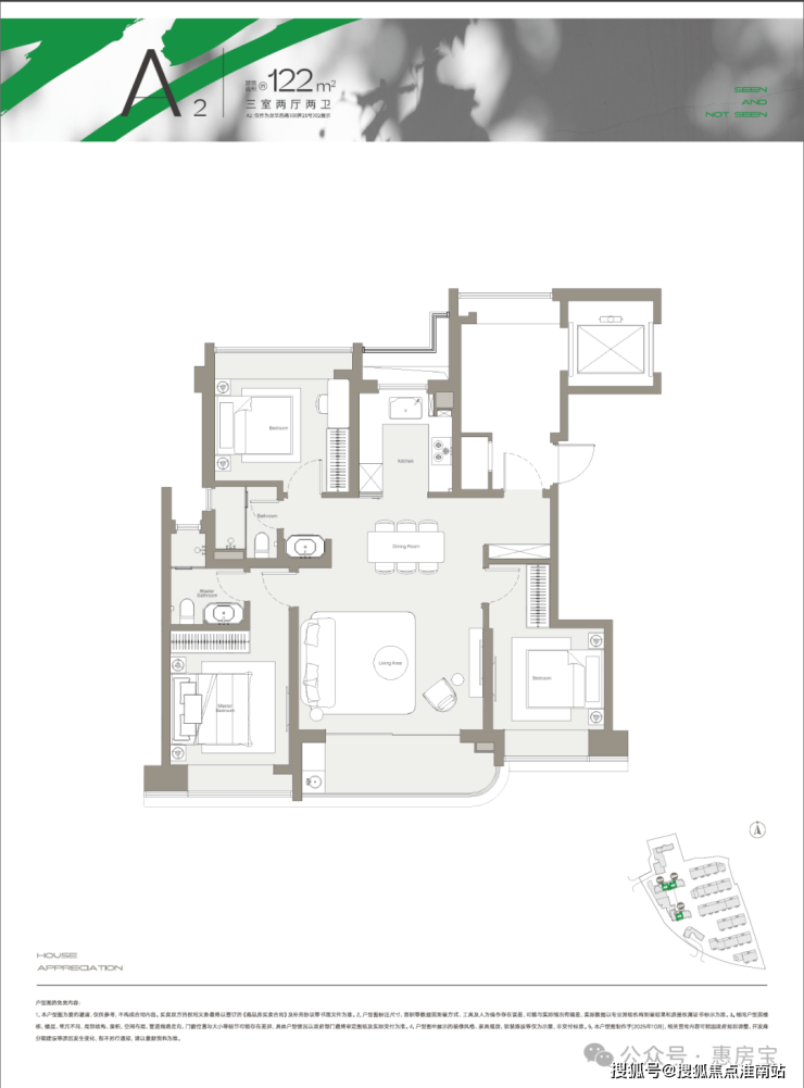 项目洋房产品主力户型为建面约100-122m²三房户型,共计107套;采用两梯三户/四户设计。