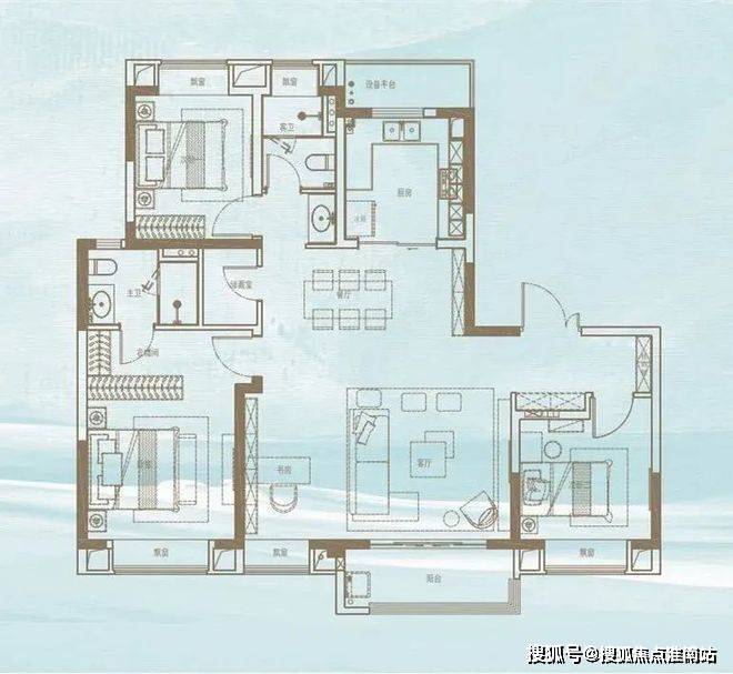 119㎡户型:3 室 2 厅 2 卫,主卧套房设计,得房率 81%。