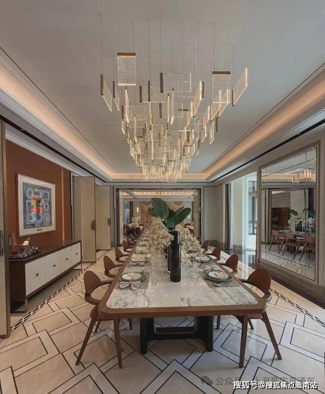 上海浦东绿宝园·翡梵售楼处电话☎:400-8818-994(预约看房热线)ART DECO风格的黑白拼花大理石地面与大面积镜面墙设计,延展了入户空间的视觉深度。如璀璨星环水晶环形吊灯,增添了归家的仪式感。奢华的玉石背景墙与法式经典家具相映生辉,在静谧与华美之间,彰显翡梵空间的非凡气度。餐厅与西厨之间,八扇手工定制的电动旋转立门,宛如天工造物般的巧思令人惊艳。每一扇门均镶嵌意大利SICIS内含铂金的奢华马赛克,天然贝壳面板在灯光下折射出璀璨光芒。门扇的开合间,实现了空间的灵动转换,私密与开放的完美平衡,为社交与生活增添无限乐趣。每一处细节都经过大师级的匠心打磨,呈现出一场视觉与感官的极致盛宴
