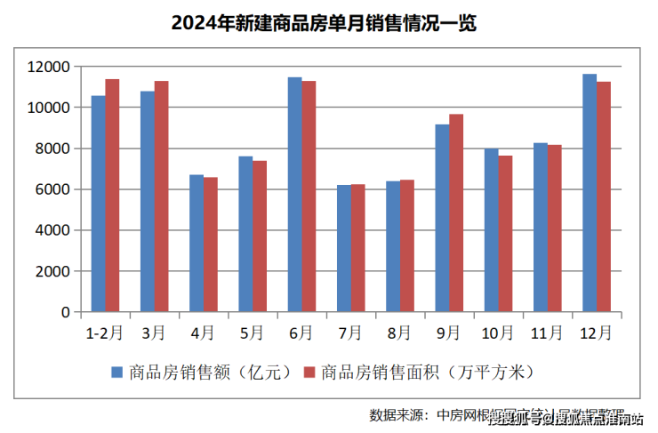 但从单月情况看,在促进房地产市场止跌回稳各项政策作用下,12月份楼市积极因素继续累积,市场交易较为活跃,新建商品房销售面积和销售额都实现了正增长。根据中房网测算,12月份新建商品房销售面积为11267万平方米,环比上涨37.60%,同比上涨0.37%;新建商品房销售额为11625亿元,环比上涨40.57%,同比上涨2.84%。