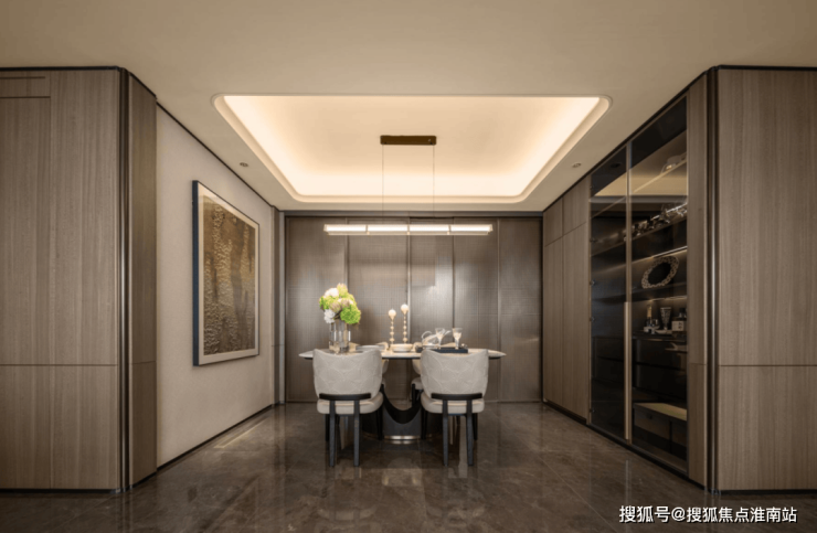 有一个细节大家可以在实地看样板间时留意:交付的内嵌式冰箱面板也是采用了木饰面,高级感扑面而来!吊顶和墙面采用