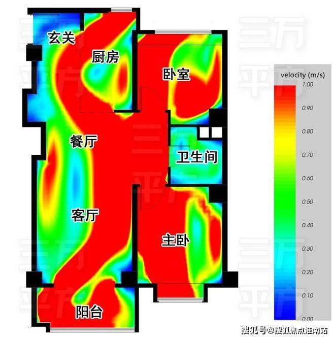 得益于南北通透的户型,这个户型通风是非常好的,三万平方做了分析:
