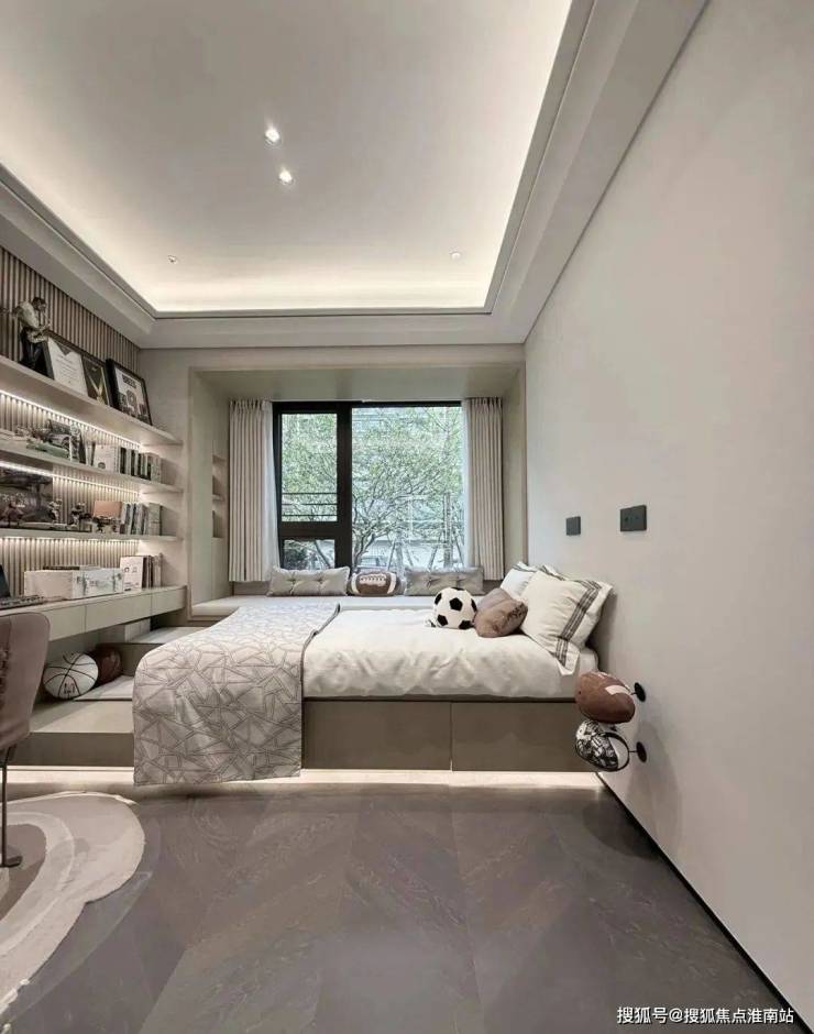 其中主卧的270°转角飘窗就有约5.7m²,通过与外立面的结合,直接做了梳妆台和储物柜,拓展了飘窗的实用性。