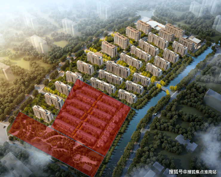 (北辰观澜府69号地块鸟瞰图,红色区域为别墅新品及内部园林)