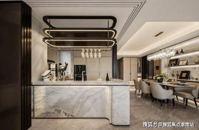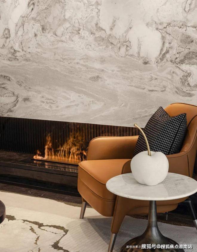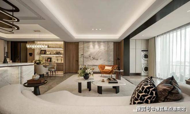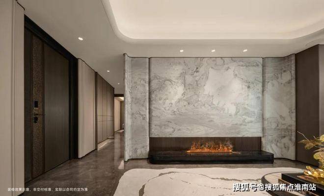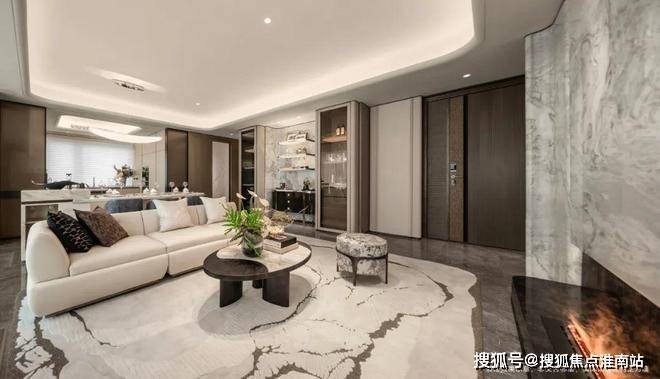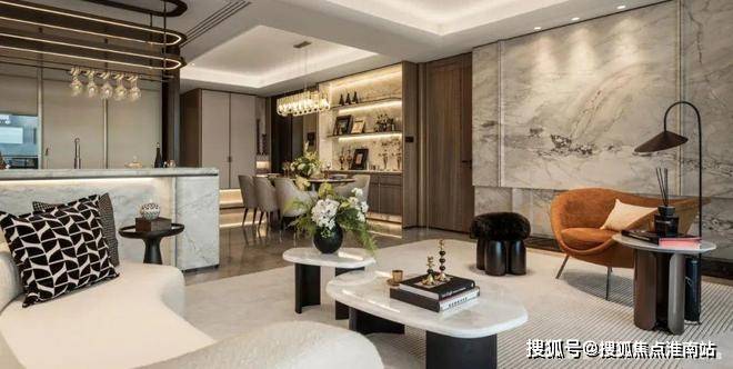 The"MistyandRainyJiangnan"naturalmarbleonthebackgroundwallofthelivingroomisdifferentfromthetraditionalflatbackgroundwall.Throughthetreatmentofcurvedandthree-dimensionalshapesandinlaidwithstainlesssteelmaterial,forJinmao,whatismoreexpensivethanluxurystonesistotrulyintegrateluxurystoneswiththeatmosphereofthespace