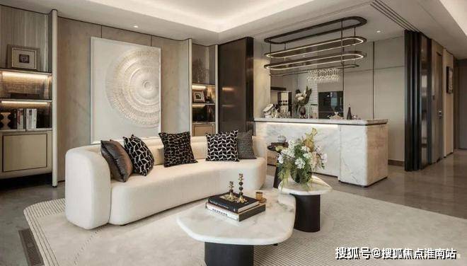 客厅背景墙的“烟雨江南”天然大理石,不同于传统平面背景墙,通过弧度及立体的造型处理,并镶嵌不锈钢材质,对于金茂而言,比奢石昂贵的,是让奢石真正与空间气场融为一体