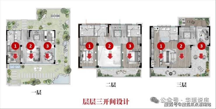 1F长辈房是类套房的设计;2F可以设计两个全明套房,还有一个客厅挑高自由空间随你发挥;3F是主人独立休闲王国,星级大套房、活动室、露台应有尽有。