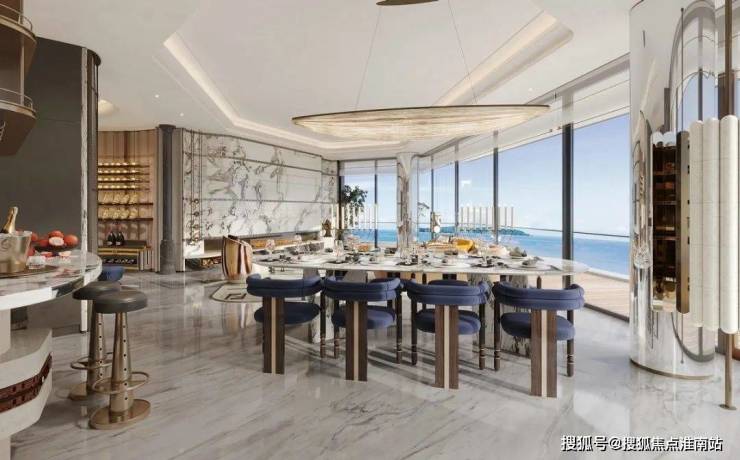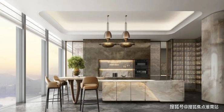 开放式的客餐厅设计,吊顶侧边一些细节的处理与柜子的钢条和大理石的分缝有一些联系,整体立面的横向缝隙的高度都有一些相应的联系,让空间的感受更为整体并且相互之间有一些联系。