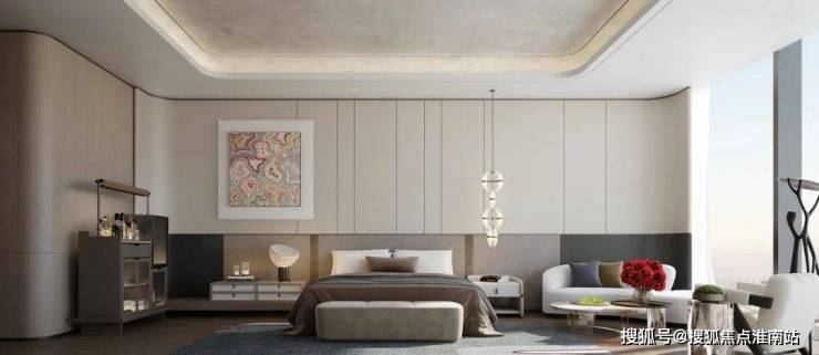 主卧的空间相对较大,背景是利用左侧的窗帘做的对称硬包的处理,其实后面有暗藏的灯带,使层次更为丰富一些,整体的家私和风格的感觉延续客厅,注重品质和空间的感受。