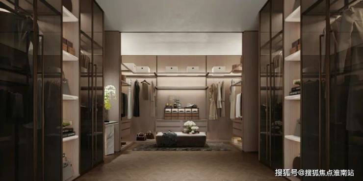 主卧的床尾处利用空间的在设计利用多了一个去向主卫的衣帽间,门套整体上顶的设计让房门门套的感觉更加整体耐看,衣帽间作为主卫和主卧的转折空间也赋予了更多的实用性。