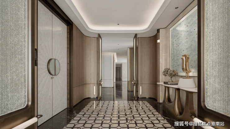 透过鞋柜看向过道,门全部做了到顶的处理,中间的腰线在公共开放区域是整体贯穿的元素,并结合柜门的开启高度,硬包的中线高度等等做了一个整体的联系。