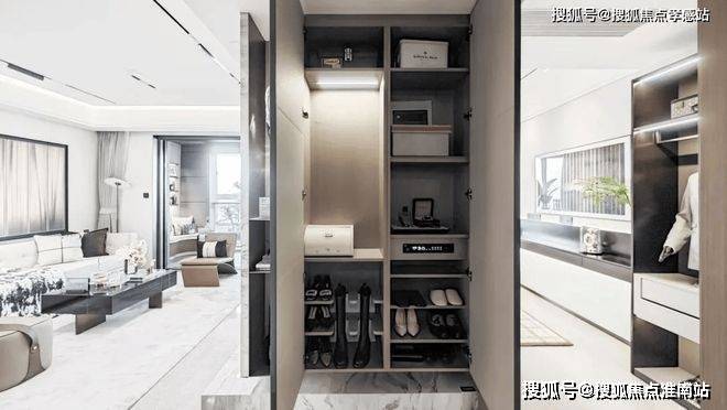 入户后,所有玄关柜都是交付标准,还特别配备了“除臭精灵”,下方预留了扫地机器人的空间,为日常生活带来便利;项目采用了大金品牌的中央空调地暖两联供系统,以及格兰斯柯的新风系统。