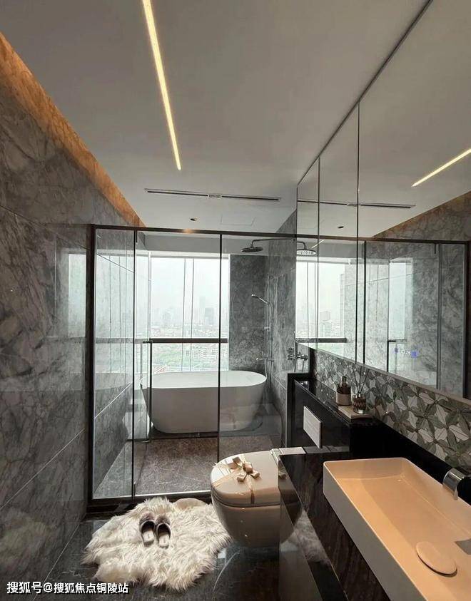 全景落地窗 + 石材地面 + 定制收纳系统