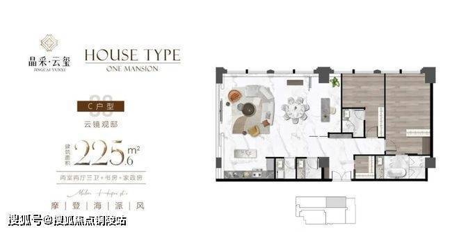 225㎡ 3–4房2厅3卫(横厅设计,主卧套房+独立衣帽间)