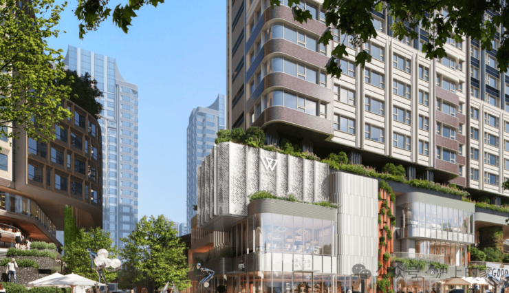 顾名思义,一方面它被绿意环抱,比如商业立面采用绿色植物与橙色釉面的碰撞,打造独树一帜的地标美学。同时营造六大口袋公园点缀于街区,将自然融合街区。